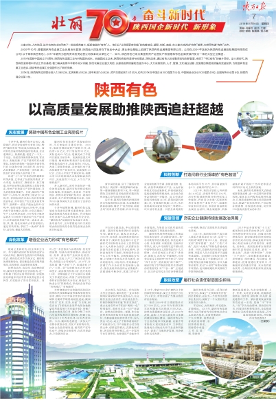 2019年是新中國(guó)成立70周年,陜西有色金屬工業(yè)與共和國(guó)共成長(zhǎng)。自集團(tuán)成立以來(lái),陜西有色始終堅(jiān)持與時(shí)俱進(jìn)、深化改革,通過(guò)有色人的辛勤勞動(dòng)和創(chuàng)新智慧,實(shí)現(xiàn)了“千億有色”的奮斗目標(biāo)。步入新時(shí)代,陜西有色堅(jiān)持穩(wěn)中求進(jìn)工作總基調(diào),著力解決發(fā)展不平衡不充分問(wèn)題,防范化解企業(yè)重大風(fēng)險(xiǎn),以提高發(fā)展質(zhì)量和效益為中心,大力實(shí)施創(chuàng)新、人才、管理、文化強(qiáng)企戰(zhàn)略,全面推動(dòng)集團(tuán)高質(zhì)量高效益發(fā)展,為我省有色金屬工業(yè)進(jìn)步、建設(shè)有色金屬工業(yè)強(qiáng)國(guó)作出了新的貢獻(xiàn)。