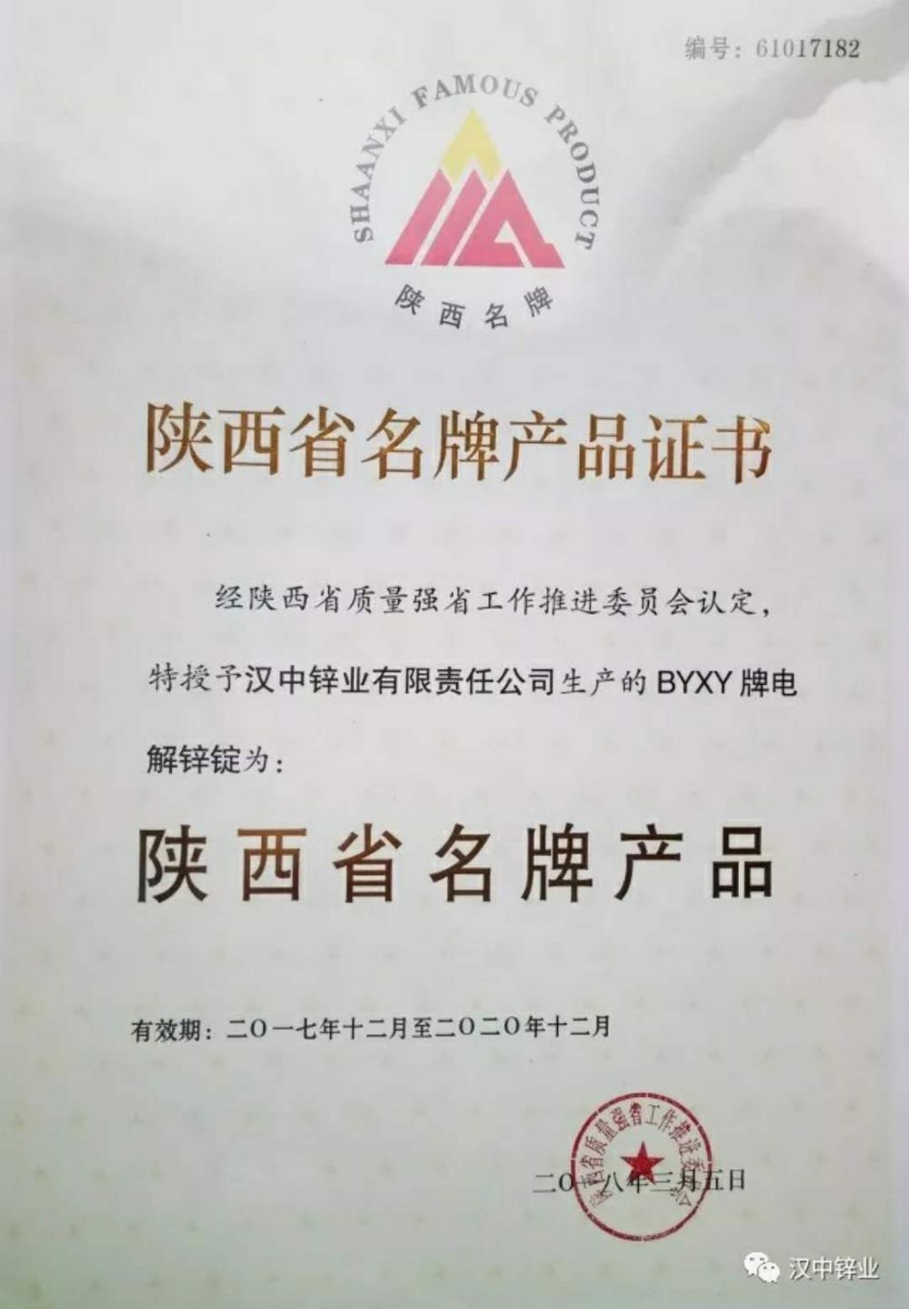 據悉,本次公司生產的BYXY牌電解鋅錠2007年首次被評委為陜西省名牌產品后,連續11年保持殊榮,陜西省名牌產品每四年復審一次,也是公司第四次榮獲陜西省名牌產品。